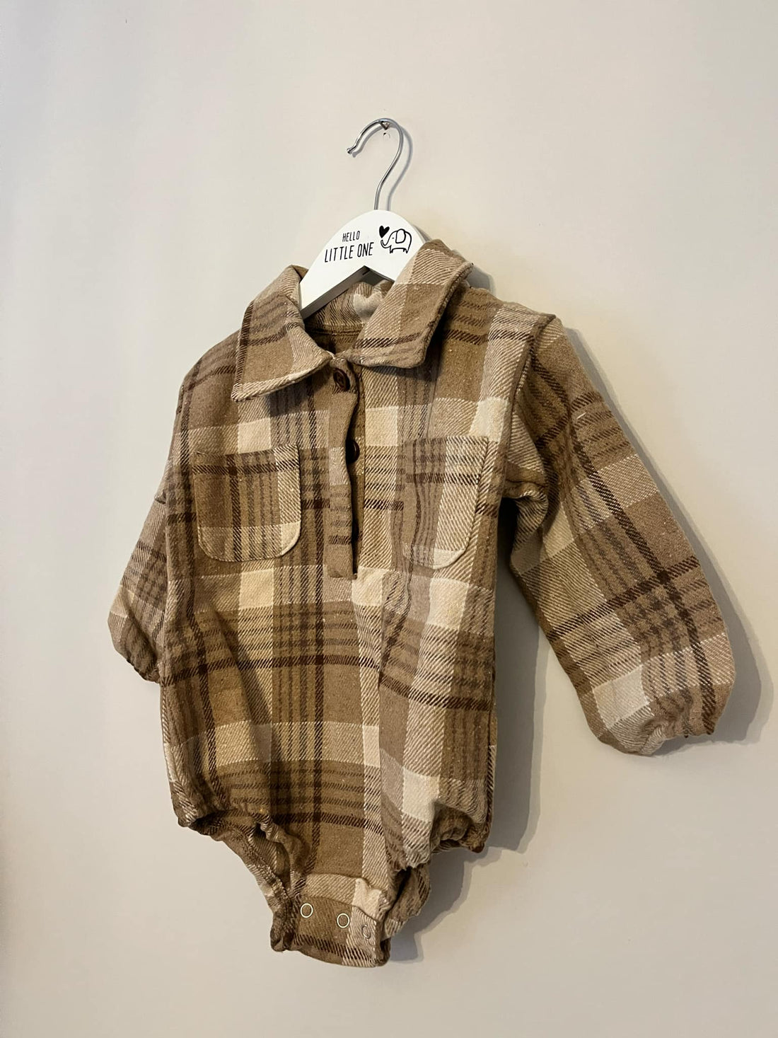 Adorable brown plaid checked romper perfect for your little one's wardrobe! This long-sleeve style keeps...