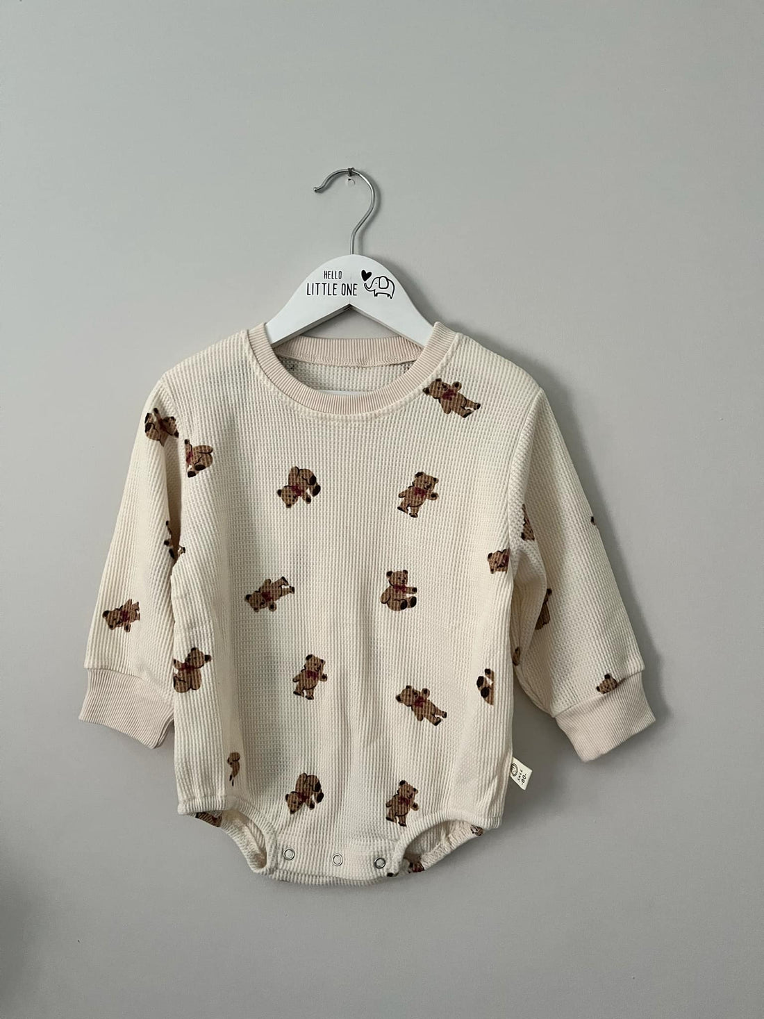 Snuggle up in softness with this adorable cream waffle romper, featuring a charming teddy print...