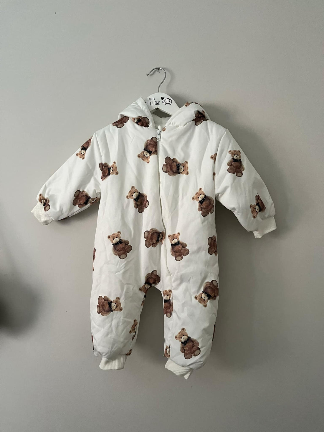 Wrap your little one in cosy comfort with this adorable white teddy bear print puff...